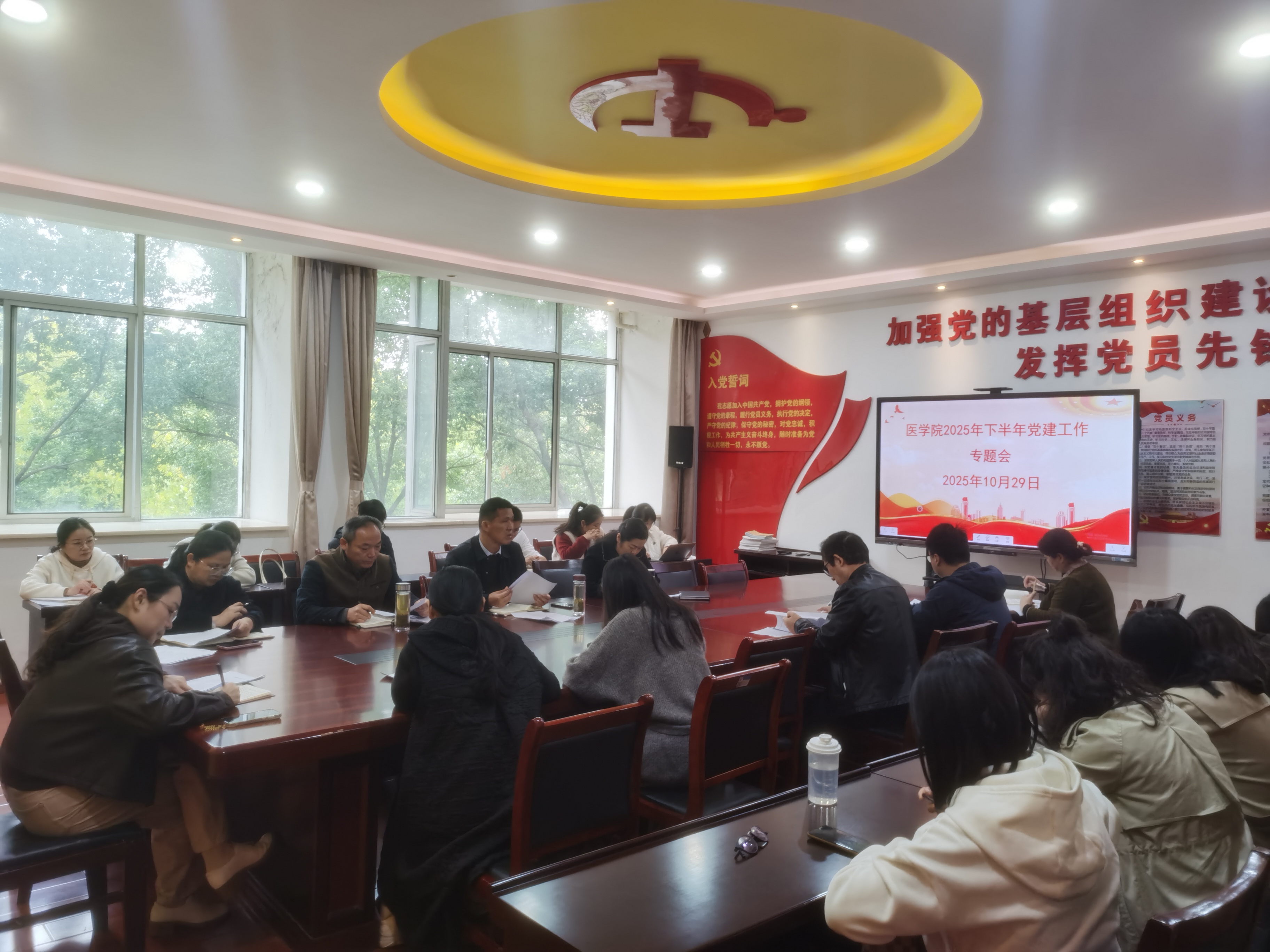 为全面提升医学院基层党组织党建工作水平,更好推进下半年学院党建工作有效开展,进一步夯实基层党组织建设,10月29日下午,医学院在医学楼214党员活动室召开2025年下半年党建重点工作推进会。医学院党总支副书记(主持工作)邹华兵主持会议,院长孙美兰出席会议并讲话,党总支委员、各党支部书记及委员参会。