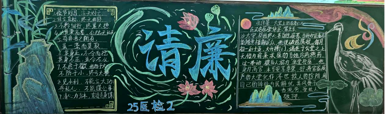 廉洁是中华民族的传统美德,更是新时代青年应秉持的道德准则与职业操守。此次活动自启动以来,得到了医学院各班级的积极响应。同学们以班级为单位,围绕“廉心巧手・绘就清风”的主题,将廉洁文化与医学职业伦理相融合,通过巧妙的构思、精美的绘画和生动的文字,在黑板报上勾勒出对廉洁的理解与追求。有的班级以古今廉洁人物事迹为素材,讲述廉洁故事;有的班级结合医学行业特点,展现医护人员廉洁行医的职业操守;还有的班级以漫画、标语等形式,传递廉洁自律的重要意义。