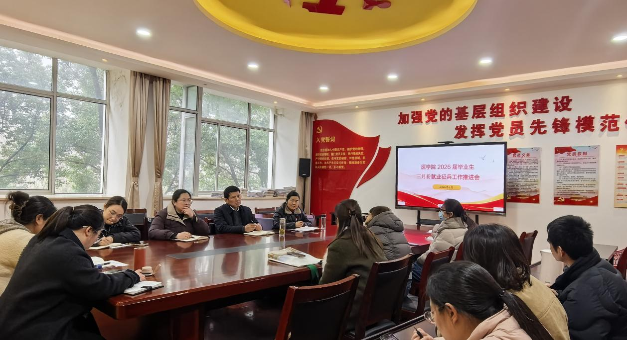 为扎实推进2026届毕业生就业与征兵工作,精准对接学生就业需求,医学院于3月18日下午在党员活动室召开2026届毕业生三月份就业与征兵工作推进会。医学院院长孙美兰、党总支副书记(主持工作)邹华兵、党总支副书记梁春艳以及2026届全体毕业班辅导员参加会议。