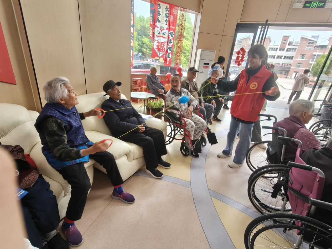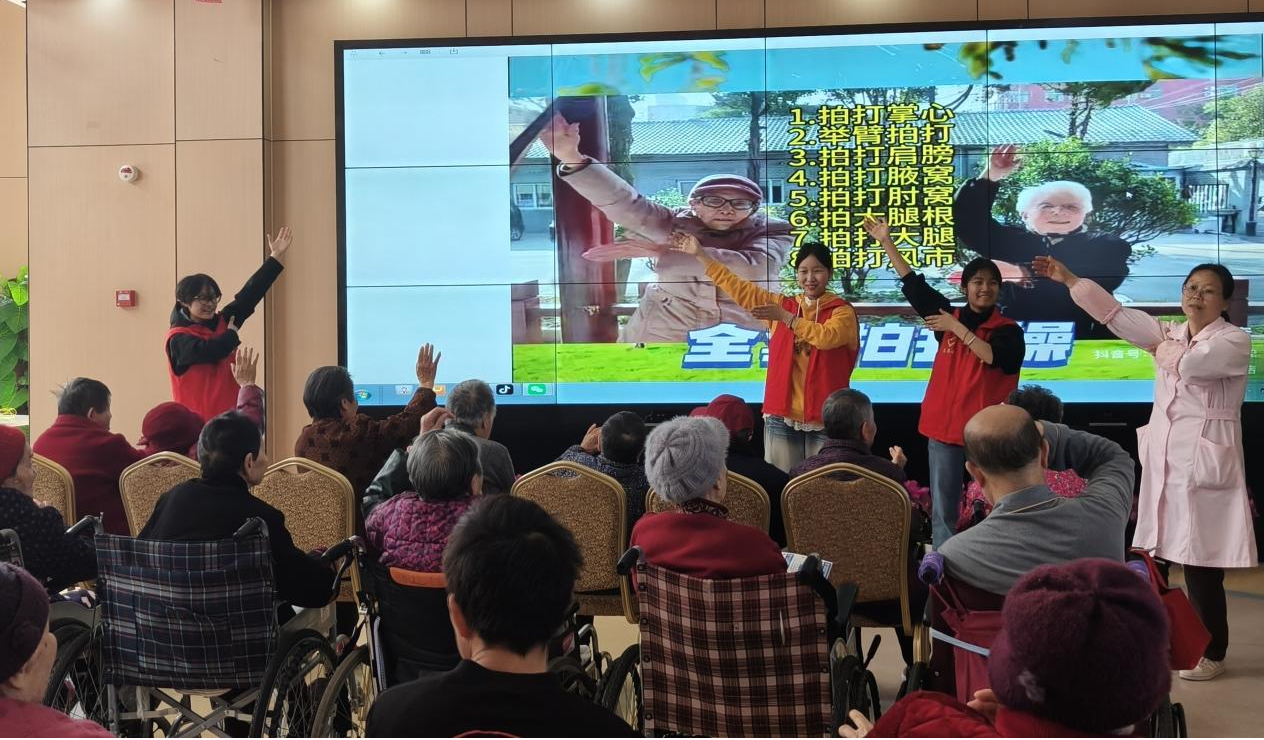 讲座结束后,志愿者们组织老人们开展了丰富多彩的文体活动,让护理院充满了欢声笑语。志愿者们与老人们围坐在一起共唱红歌,经典的旋律勾起了老人们的美好回忆,大家放声歌唱,传递着对党的热爱与对美好生活的向往;随后,志愿者们带领老人们练习全套拍打操,动作舒缓柔和、简单易学,既能促进血液循环,又能缓解身体疲劳,老人们认真跟随学习,现场氛围十分融洽;趣味十足的手拉球活动更是点燃了现场热情,老人们两两配合、相互协作,在轻松愉快的互动中锻炼了身体,也增进了彼此间的情谊。