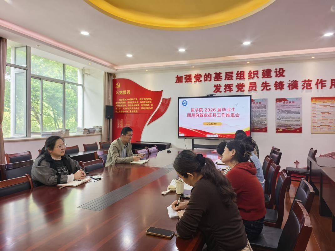 为扎实推进2026届毕业生就业征兵工作,压紧压实工作责任,抢抓春季就业关键期,4月17日下午,医学院在党员活动室召开四月份毕业生就业征兵工作推进会。学院领导及毕业班辅导员参会,会议由医学院党总支副书记梁春艳主持。