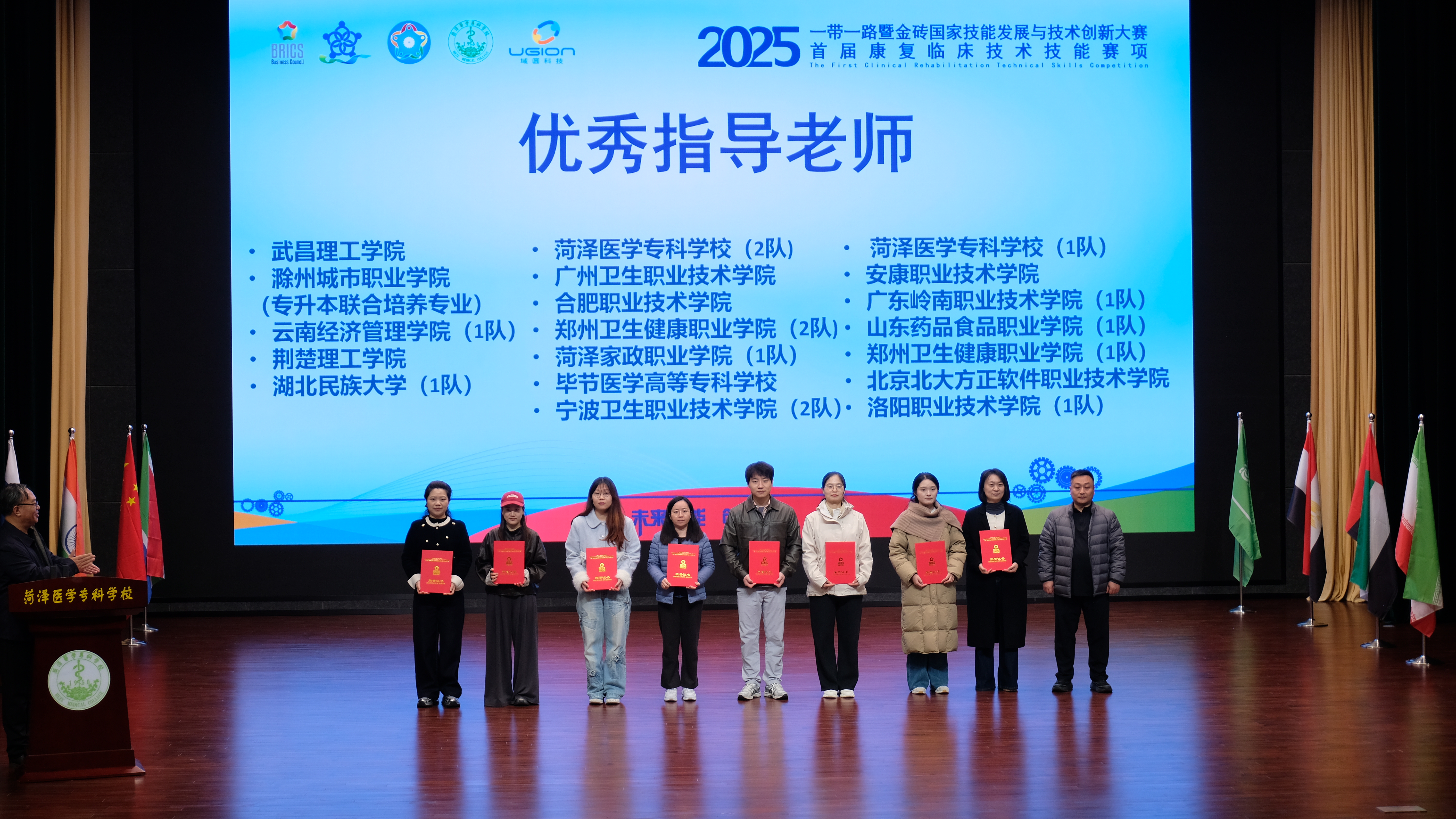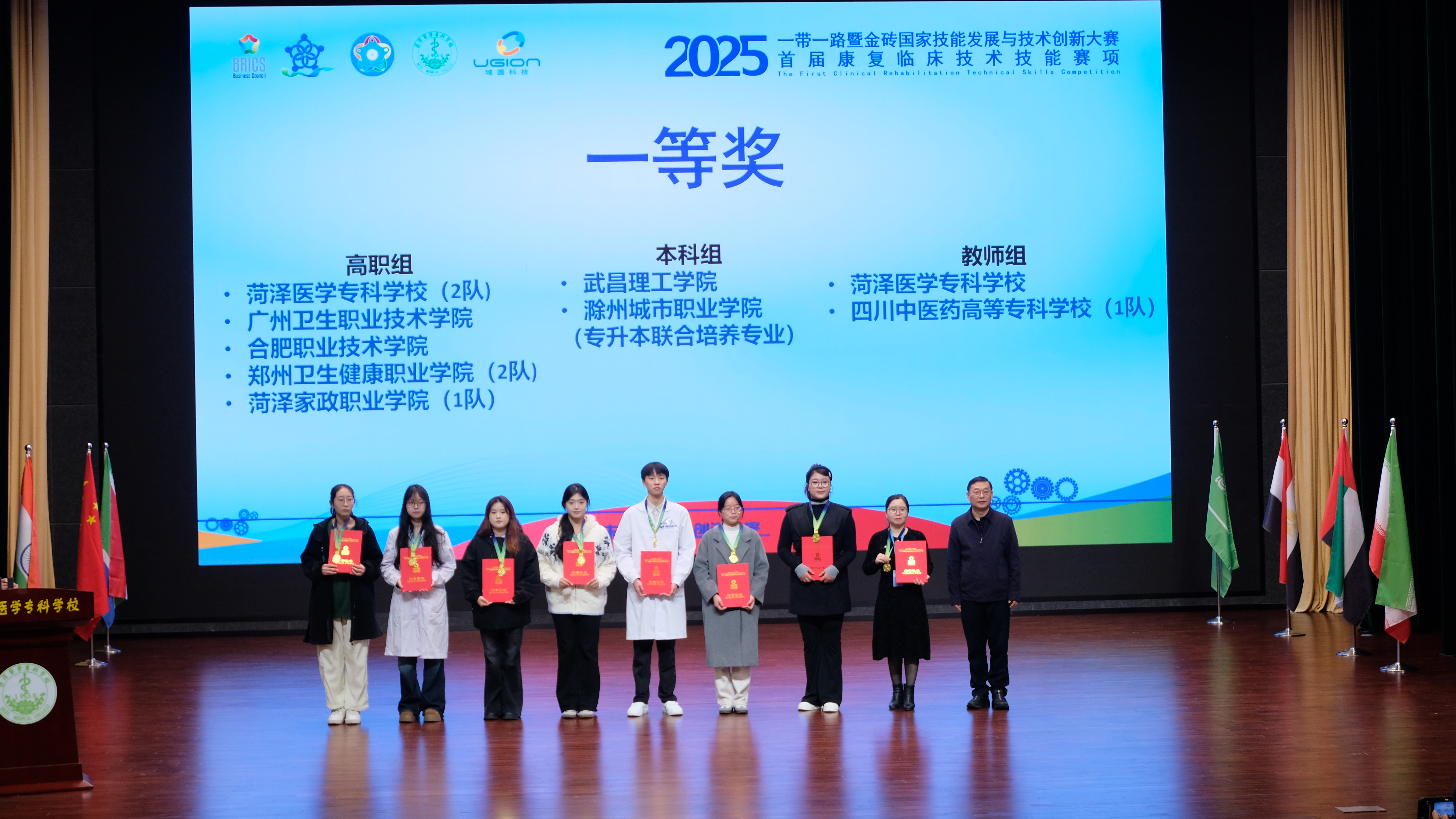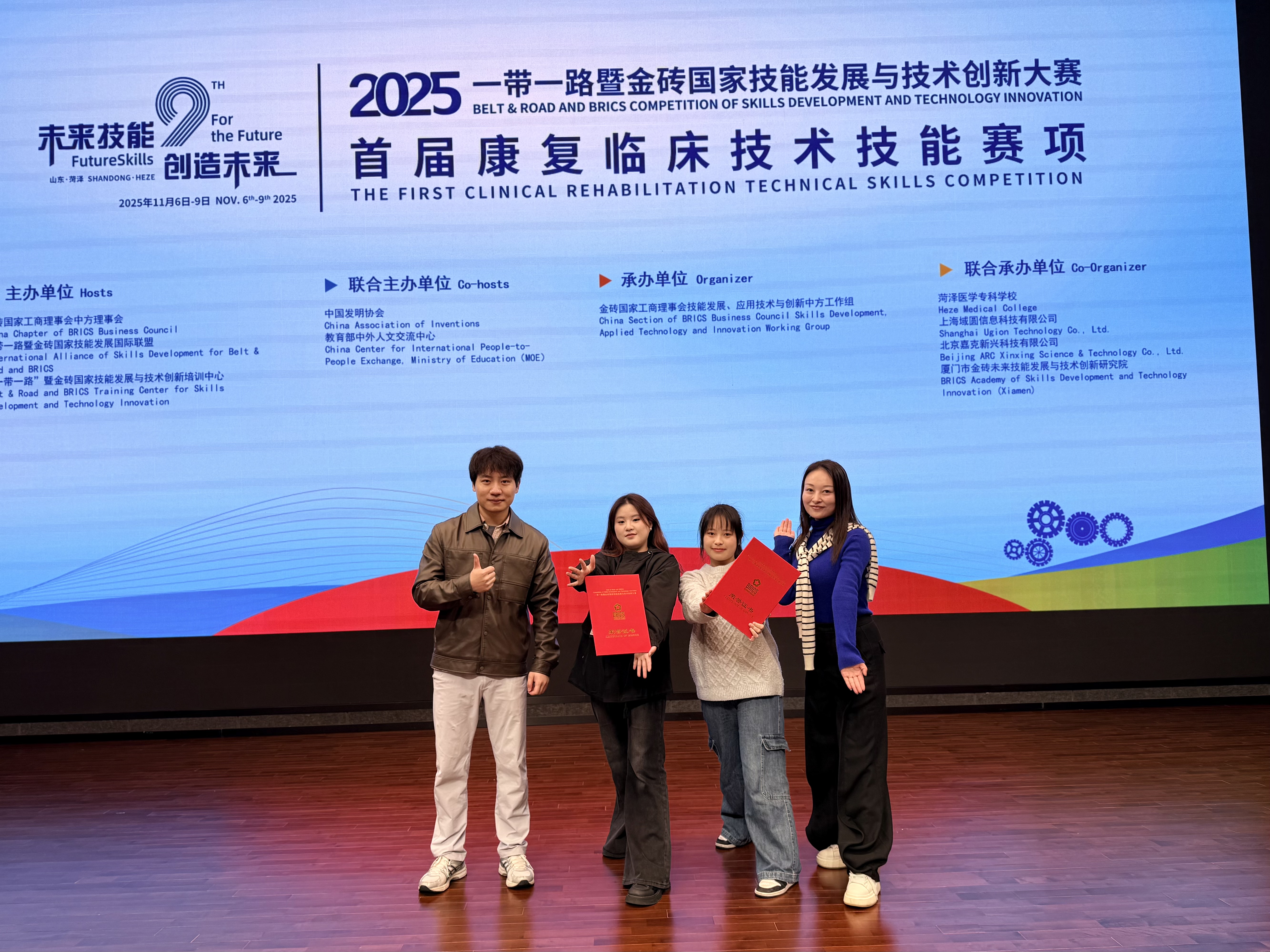 11月9日,2025一带一路暨金砖国家技能发展与技术创新大赛之首届康复临床技术技能赛项在菏泽医学专科学校圆满落幕。我校康复治疗技术专业学生柏家园、周奕组队在全国46支高职组参赛队伍的激烈角逐中脱颖而出,凭借扎实的专业功底和出色的实操能力斩获高职组一等奖,指导教师杨万琪、甘琴荣获“优秀指导教师”称号,学校被大赛组委会授予“最佳组织奖”,充分展现了我校康复治疗类专业的教学实力与人才培养质量。